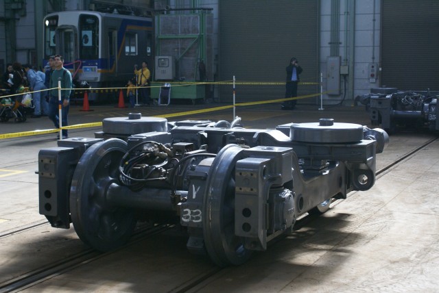| 間近に見る2000系の台車。 このほか、今年拠出された6100系のパイオニアV台車も展示されていた。 |